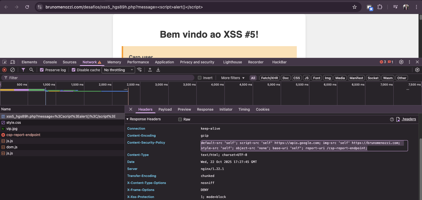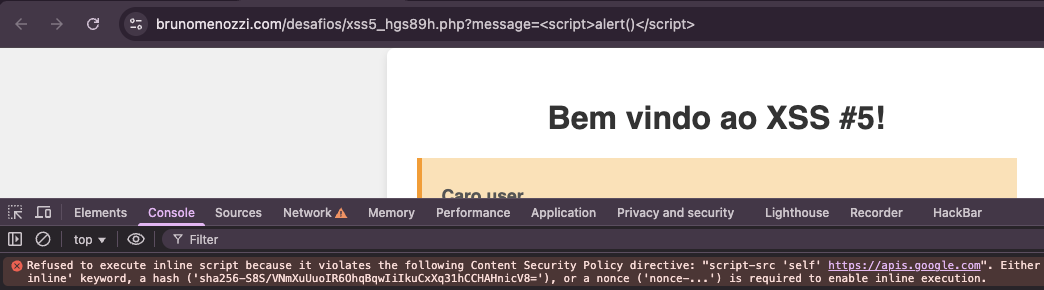 Resultado: O script inline é refletido, mas bloqueado pelo CSP (scripts inline não permitidos, só ‘self’ ou apis.google.com). Um relatório de violação CSP é enviado.https://brunomenozzi.com/desafios/xss5.php?message=<script>alert(1)</script>