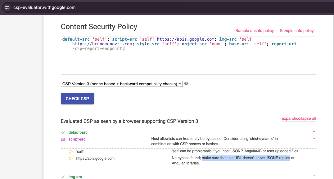Content-Security-Policy: default-src 'self'; script-src 'self' https://apis.google.com; img-src 'self' https://brunomenozzi.com; style-src 'self'; object-src 'none'; base-uri 'self'; report-uri /csp-report-endpoint;