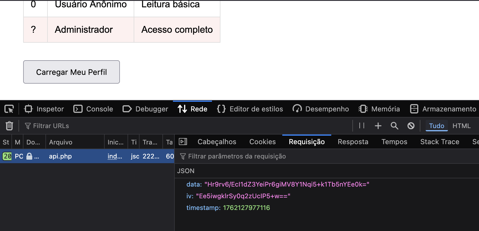 Clicando no botão “Carregar Meu Perfil”, observamos na aba Network do DevTools: