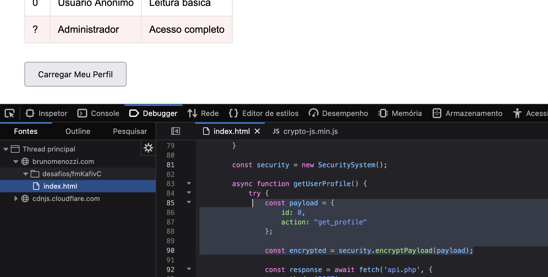 Inspecionando o código fonte, descobrimos a função getUserProfile() que é chamada pelo botão. Analisando seu conteúdo: